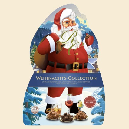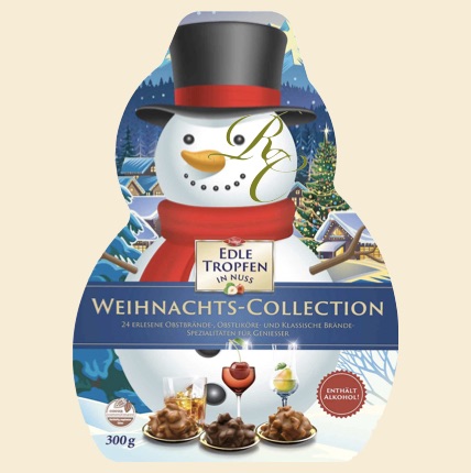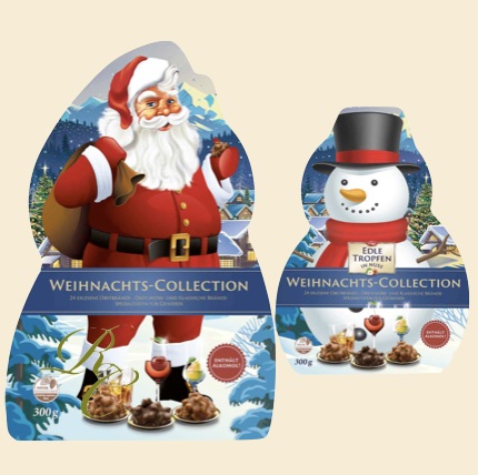 Fruktig variation av praliner. Trumpf ädle droppar i nötter är en julkalender kombinerar populära fruktkonjak och andra spritdrycker som plommonbrandy, kirschbrandy, Williams-Christ päronbrandy, hallonbrandy, aprikoslikör, cassislikör, persiklikör, calvados och cognac med delikat mörk och mjölkchoklad. Den finkristalliserade sockerskorpan och de krispiga hasselnötsplintarna avrundar njutningen.